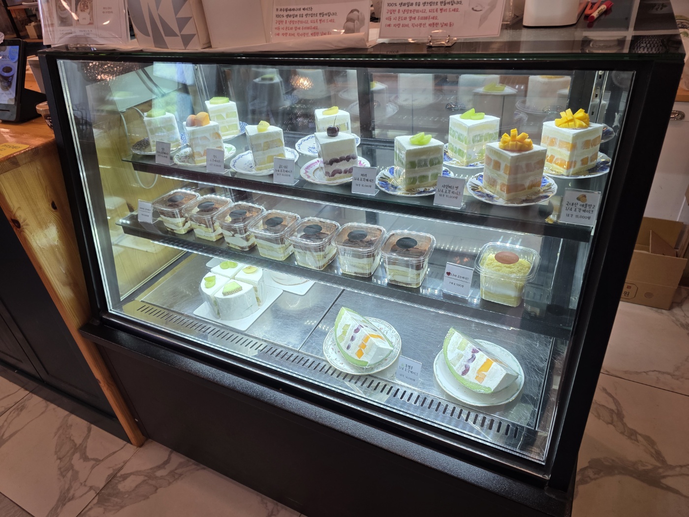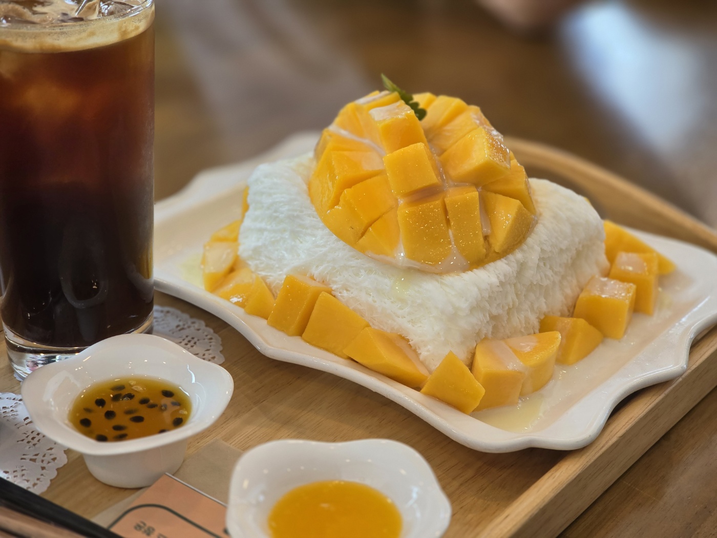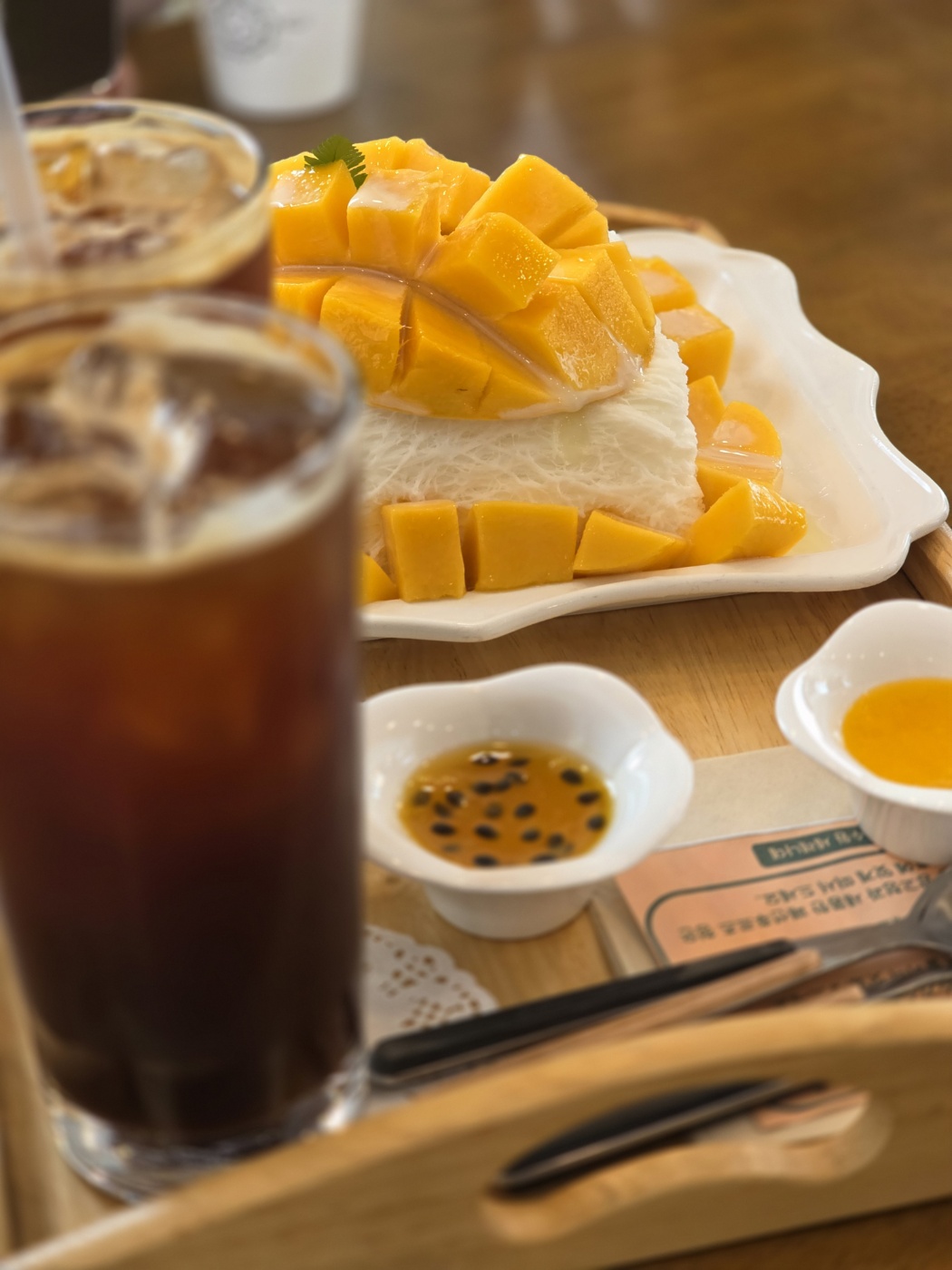 이곳의 진짜 하이라이트는 바로 망고 실타래빙수! 실같이 얇게 갈린 부드러운 우유빙수에 달콤한 망고가 듬뿍 올라간 빙수는 보기만 해도 시원해지더라고요. 새콤달콤함에 연유 맛까지 더해져 한 입 먹는 순간 “이거다!” 싶었어요. 망고 실타래빙수 외에도 여름 과일 조각케이크, 파운드케이크, 수제 에이드, 커피 등 디저트 종류가 다양해서 선택 장애 오게 만드는 곳이에요. 전반적으로 맛의 퀄리티가 높아서 다 만족스러웠어요.