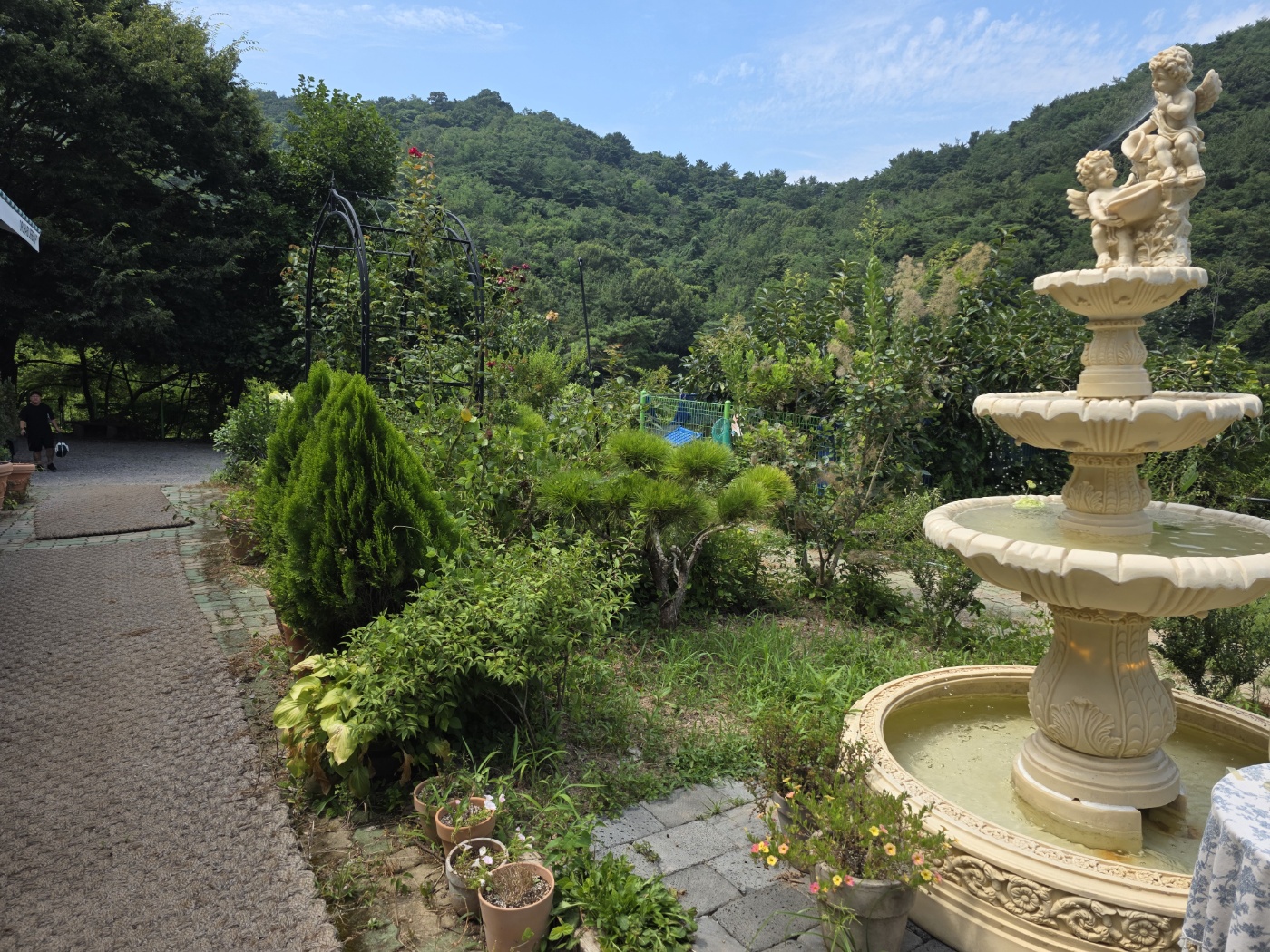 카페에 도착하자마자 마주한 건 잘 가꿔진 정원과 다양한 동물들이었어요. 염소, 닭, 토끼가 자유롭게 놀고 있는 풍경은 마치 시골 마당에 온 것 같았답니다. 목가적인 풍경과 함께 자리 잡은 아늑한 단층 주택형 건물이 눈에 들어왔는데, 외관만 봐도 여기가 디저트와 감성의 천국이라는 느낌이 팍 왔어요. 정문과 주차장 분수대와 어우러진 야외 공간은 맑고 깨끗한 느낌을 주었고, 포토존으로도 완전 딱이었어요!